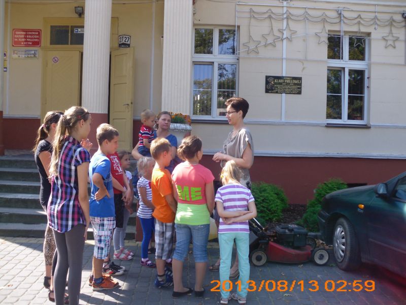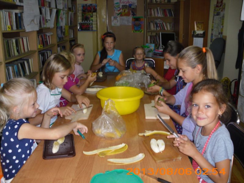 odżywiać się zdrowo więc przyrządziły pyszną owocową sałatkę.Dużą atrakcją okazały się wyjazdy do kina i na basen do Wągrowca oraz do Gminnego Centrum Kultury i Biblioteki w Kcyni. W GCKiB dzieci miały możliwość obejrzenia prac pałuckich rzezbiarzy. Każdego dnia był słodki poczęstunek a na zakończenie pieczone kiełbaski, dyplomy i drobne upominki.