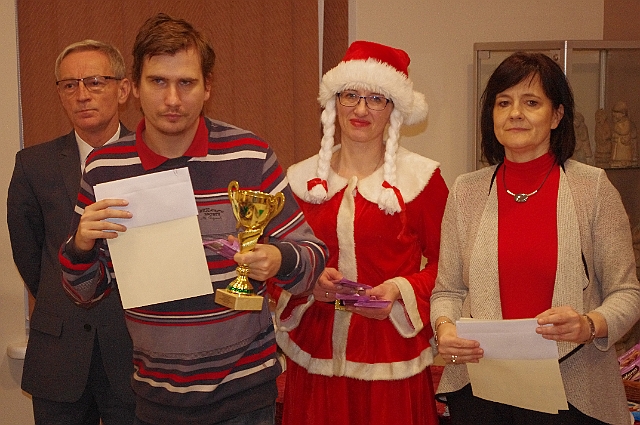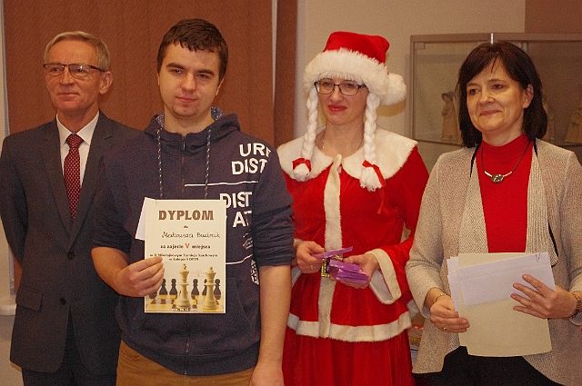 na wiek, otrzymał słodki upominek od Mikołaja, a dodatkowo ci zawodnicy, którzy zagrali w czapce Mikołaja – wyjechali z dodatkową tabliczką czekolady. Miłe było również wręczenie podziękowań za organizację i przeprowadzenie zawodów Jarosławowi Wiśniewskiemu, któremu pani Ilona Kurdelska wręczyła dyplom i pamiątkową figurkę pałucką (idealnie wkomponowała się pomiędzy puchary). Przebieg turnieju oraz liczny udział szachistów z naszego województwa i okolic, stały się doskonałą reklamą i promocją szachów. Gościnność kcyńskiego domu kultury zapadła w pamięci uczestników, którzy z pewnością przyjadą tutaj z chęcią na kolejne zawody. Mamy też słowo pana Burmistrza Marka Szarugi, że z chęcią pomoże w organizacji w przyszłym roku w Kcyni zawodów w randze mistrzostw województwa. Wszystko to pokazuje, że klimat do szachów w tym mieście jest wyśmienity, czego dowodem jest coraz