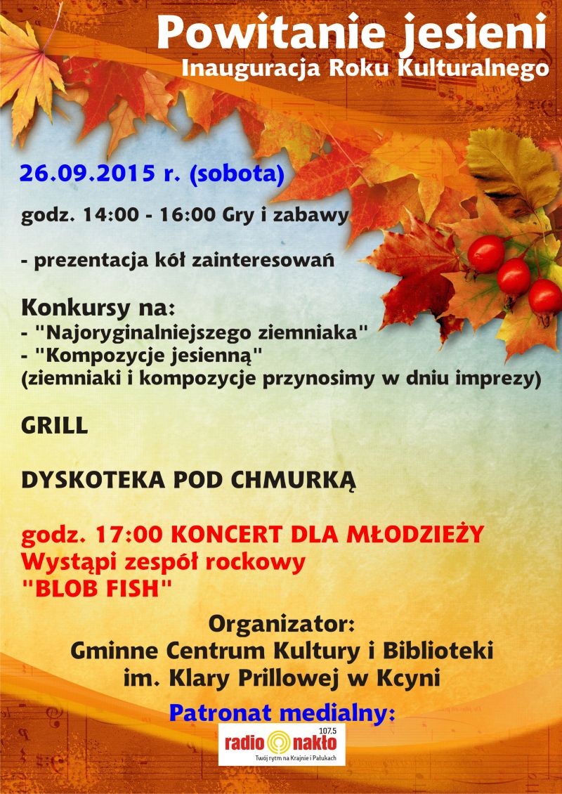 Serdecznie zapraszamy już 26 września na imprezę "Powitanie jesieni" podczas której zapisać będzie można dzieci na koła zainteresowań działające przy GCKiB w Kcyni: