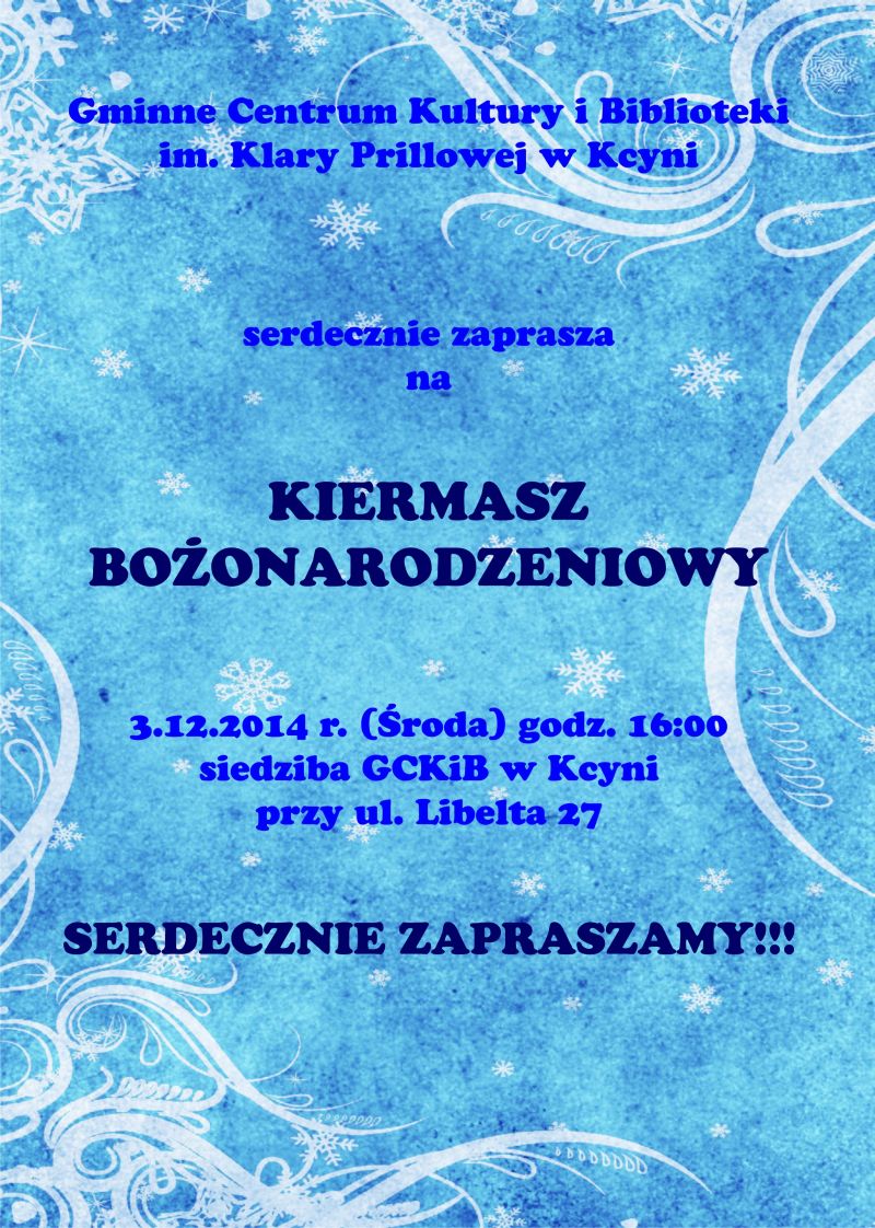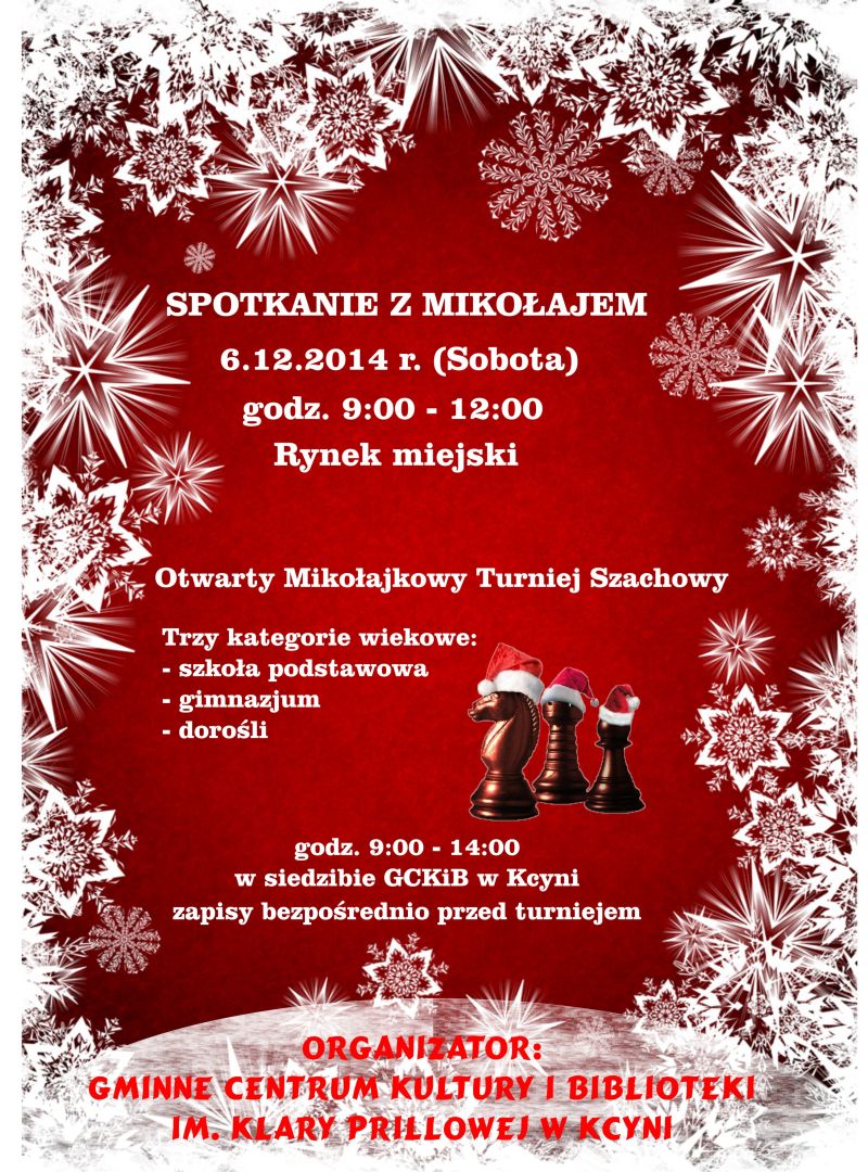 Serdecznie zachęcamy wszystkich chętnych do wzięcia udziału w Mikołajkowym Turnieju Szachowym organizowanym przez Gminne Centrum Kultury i Biblioteki im. Klary Prillowej w Kcyni do zapoznania się z regulaminem turnieju dostępnym tutaj.