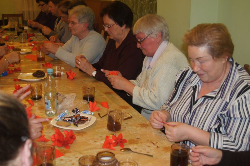 uczestnicy poznają różne techniki rękodzieła a przy okazji spędzają miło czas na rozmowie i wspólnej zabawie. Z uwagi na zbliżające się Święta Bożego Narodzenia uczestnicy zajęć wykonują aktualnie ozdoby świąteczne pod okiem Pani