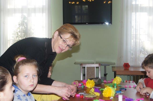 okazję wykonać różnego rodzaju ozdoby z krepy, bibuły i papieru kolorowego. Ponadto młodzież zwiedziła bibliotekę i miała możliwość zapoznania się z księgozbiorem placówki.