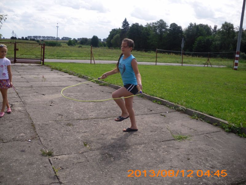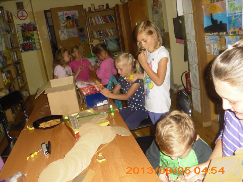 odżywiać się zdrowo więc przyrządziły pyszną owocową sałatkę.Dużą atrakcją okazały się wyjazdy do kina i na basen do Wągrowca oraz do Gminnego Centrum Kultury i Biblioteki w Kcyni. W GCKiB dzieci miały możliwość obejrzenia prac pałuckich rzezbiarzy. Każdego dnia był słodki poczęstunek a na zakończenie pieczone kiełbaski, dyplomy i drobne upominki.