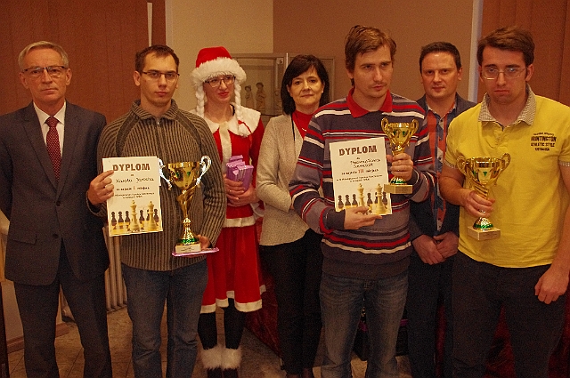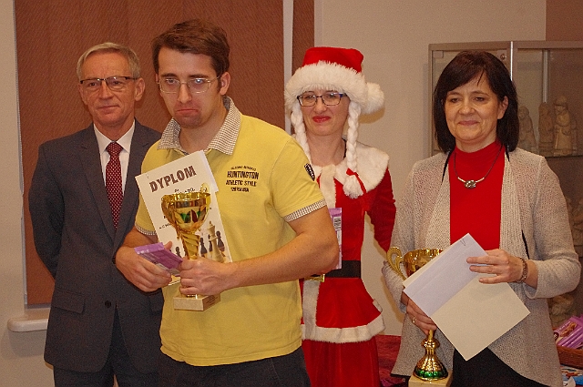 na wiek, otrzymał słodki upominek od Mikołaja, a dodatkowo ci zawodnicy, którzy zagrali w czapce Mikołaja – wyjechali z dodatkową tabliczką czekolady. Miłe było również wręczenie podziękowań za organizację i przeprowadzenie zawodów Jarosławowi Wiśniewskiemu, któremu pani Ilona Kurdelska wręczyła dyplom i pamiątkową figurkę pałucką (idealnie wkomponowała się pomiędzy puchary). Przebieg turnieju oraz liczny udział szachistów z naszego województwa i okolic, stały się doskonałą reklamą i promocją szachów. Gościnność kcyńskiego domu kultury zapadła w pamięci uczestników, którzy z pewnością przyjadą tutaj z chęcią na kolejne zawody. Mamy też słowo pana Burmistrza Marka Szarugi, że z chęcią pomoże w organizacji w przyszłym roku w Kcyni zawodów w randze mistrzostw województwa. Wszystko to pokazuje, że klimat do szachów w tym mieście jest wyśmienity, czego dowodem jest coraz