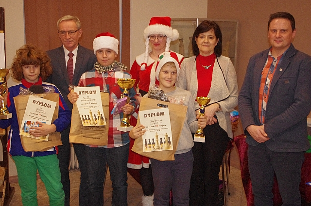 Wręczenia pucharów, nagród i słodkich upominków dokonali Burmistrz Kcyni Marek Szaruga, Dyrektor GCKiB Ilona Kurdelska oraz pani „Mikołajowa” Renata Gaj-Kowalska. Każdy z szachistów, bez względu